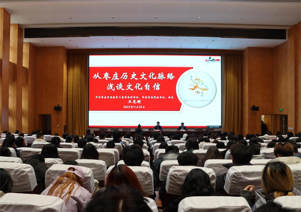 为深入学习贯彻习近平文化思想,认真落实全国宣传思想文化工作会议精神,11月29日下午,我校在崇德楼报告厅举行专题报告会,邀请枣庄市委教育工委常务副书记、市教育局党组书记、局长王光明同志作报告。报告会由校党委委员、副校长安涛主持。