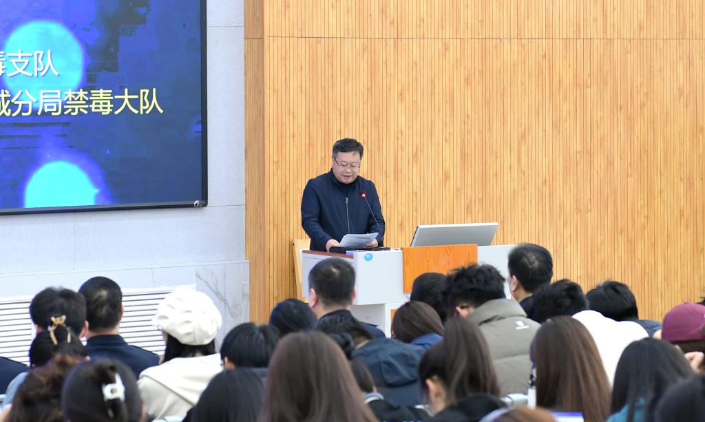 为提高识毒、防毒、拒毒能力,打造“无毒校园”,11月22日下午,我校联合枣庄市公安局在薛城校区增信楼113公共教室开展禁毒宣讲会。校党委委员、副校长丰雷,市禁毒委副主任、市公安局党委委员、副局长、交巡警支队支队长杜茂广,市禁毒办副主任、禁毒支队支队长纪尚峰,薛城分局党委副书记、政委周涛,薛城分局党委委员、副局长王洪刚出席。保卫处、学生工作处、薛城分局禁毒大队主要负责同志参加活动,各学院师生代表300余人聆听报告。宣讲会由保卫处处长王奉涛主持。