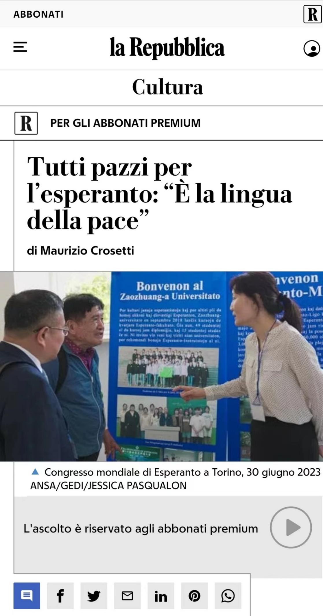 大会期间,李目海代表学校接收了德国世界语者Zsofia Korody向我校世界语博物馆捐赠的国际世界语教师协会机关报及协会出版的杂志。此外,“中国日”的活动受到意大利媒体的关注,7月31日,意大利第二大发行量报纸《共和报》(la Repubblica)对“中国日”DB中国旗舰官方网站世界语推进情况进行了报道。