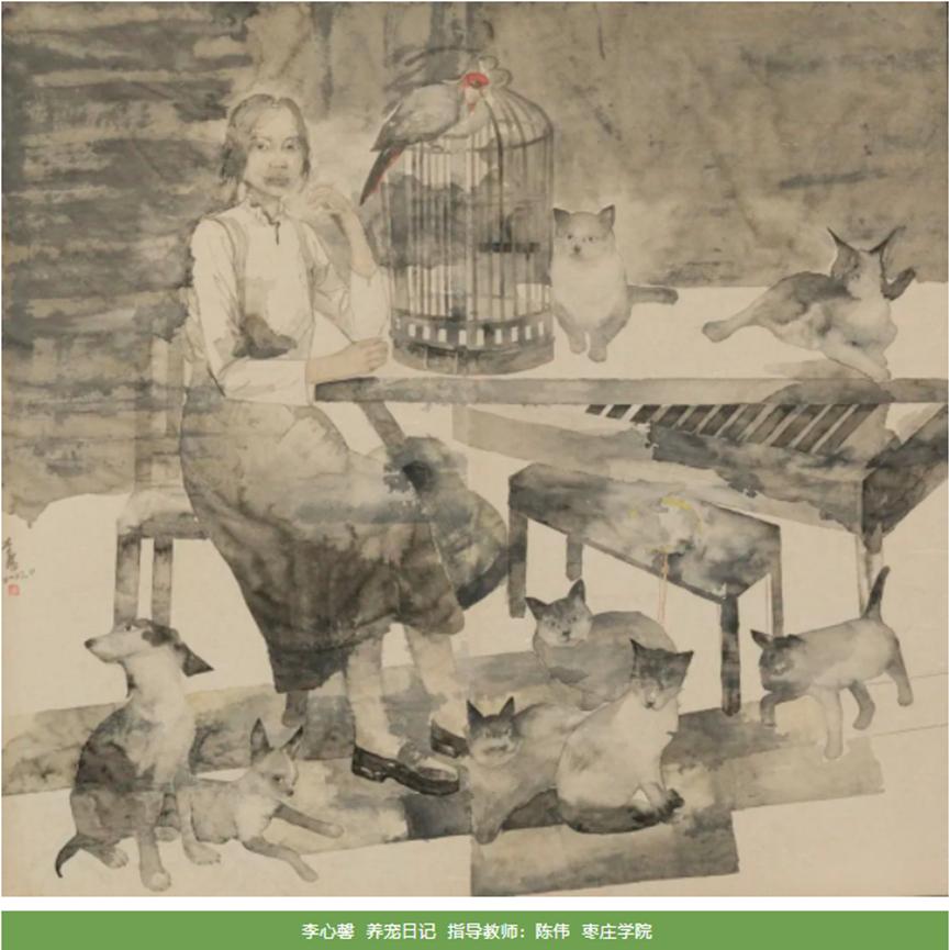 近日,第九届“青未了——山东省高等学校美术院系应届毕业生优秀作品展”颁奖活动在山东美术馆举行。我校美术与艺术设计学院选送的由陈伟老师指导李心鑫同学的作品《养宠日记》获评“优秀奖”。国画作品全省获评“优秀奖”仅5件,为此项赛事的最高奖项,本次获奖填补了我校在此项赛事中“优秀奖”的空白。