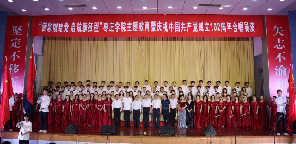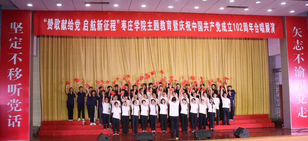 本次活动由党委宣传部主办,工会、团委、音乐与舞蹈学院共同承办。展演在合唱《我的祖国》中拉开帷幕,来自全校各二级学院和机关的19个合唱团以整洁华美的服装、高亢嘹亮的歌声、昂扬向上的朝气依次登台亮相,展示精心编排的合唱曲目,联袂为观众带来一场精彩的视听盛宴。《歌唱祖国》《唱支山歌给党听》《保卫黄河》《游击队之歌》《弹起我心爱的土琵琶》《映山红》等一首首耳熟能详、铿锵有力、大气磅礴的经典歌曲,歌颂了伟大的中国共产党,赞美了祖国的大好河山和中华民族自强不息的伟大精神,也唱出了枣院人对中国共产党的忠诚与热爱、对建党102周年的祝福与祝愿、对拥护“两个确立”做到“两个维护”的坚定与执着。
