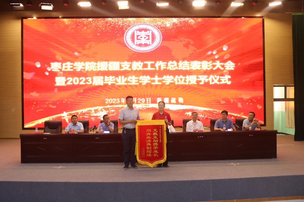 总结大会对我校援疆支教师生进行表彰。赵永刚宣读表彰决定,我校4名带队教师和201名支教学生分别被山东省援疆工作指挥部、喀什地区教育局评为“支教优秀带队教师”和“支教优秀大学生”。会上,疏勒县受援学校向我校赠送锦旗,表达对我校支教团的谢意。