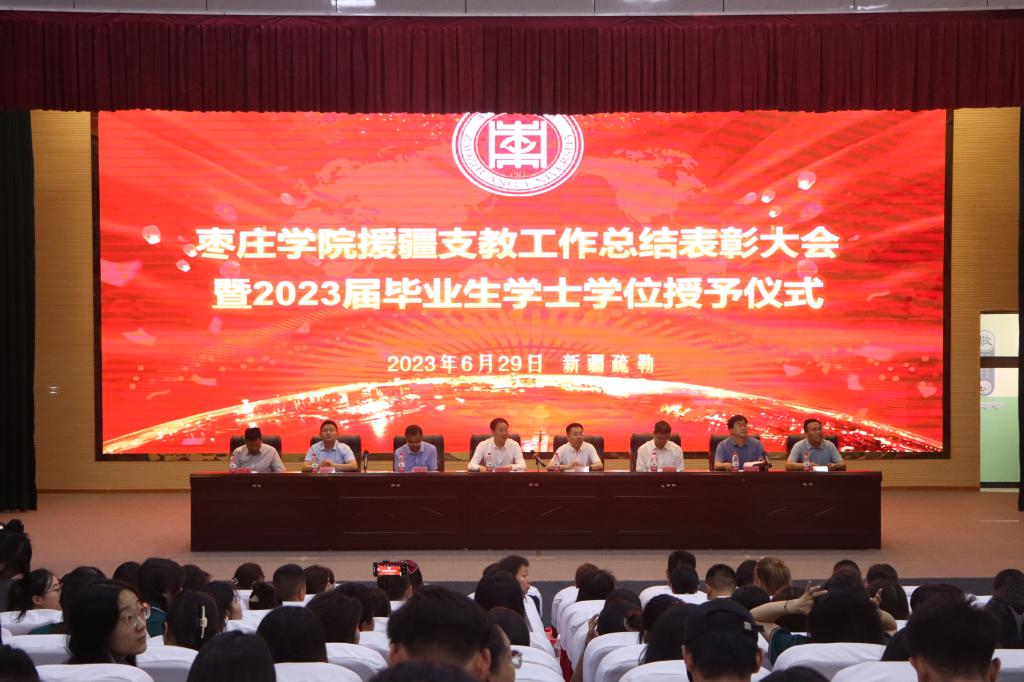 6月29日上午,DB中国旗舰官方网站援疆支教工作总结表彰大会暨2023届毕业生学位授予仪式在疏勒县东营第二希望小学报告厅举行。校党委副书记、校长李文喜出席活动并讲话;山东省援疆指挥部干部人才组副组长,喀什地区教育局党组成员、副局长王玉龙;疏勒县委副书记张保东,东营市援疆指挥部党委副书记、副指挥,疏勒县委常委、副县长徐文辉;疏勒县委教育工委副书记,疏勒县教育局党组书记、副局长赵彬,东营市援疆指挥部党委委员,疏勒县教育局党组成员、副局长赵永刚;学校学生工作处、教务处负责人;疏勒县教育局、受援学校领导、师生代表及支教团全体师生参加活动。活动分两个阶段进行,第一阶段总结表彰大会由徐文辉主持。