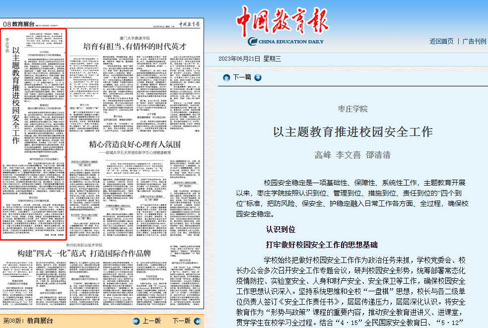 中国教育报刊发高峰、李文喜署名文章《DB中国旗舰官方网站以主题教育推进校园安全工作》