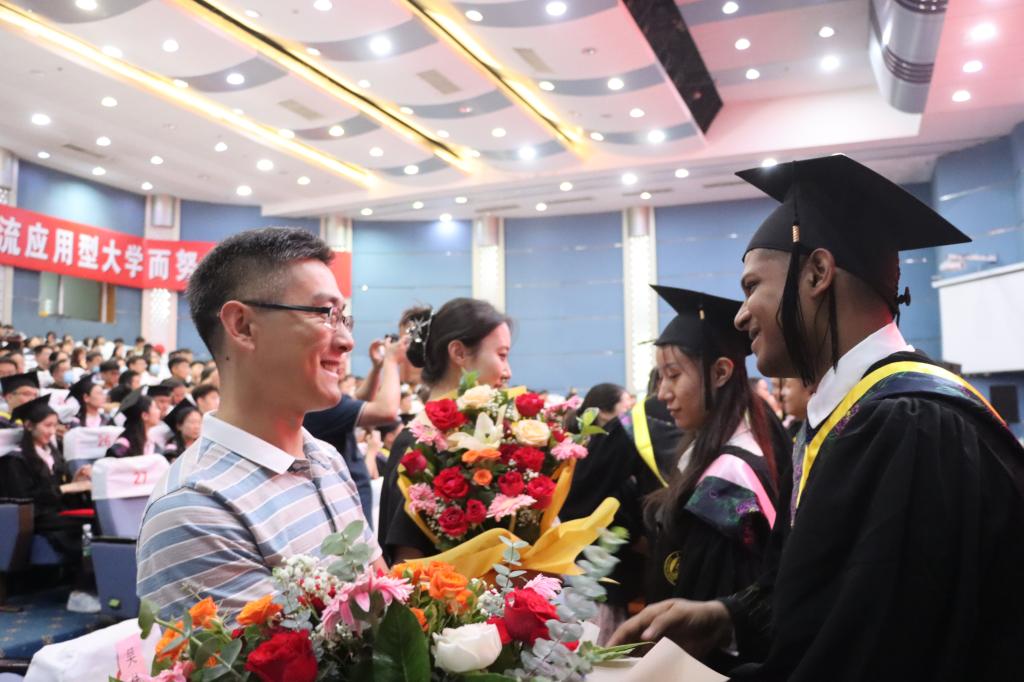 桃李芬芳,教泽绵长。典礼上,毕业生代表为老师们献上了一束束饱含深情和敬意的鲜花,对老师们的悉心教导和辛勤付出表示衷心感谢。典礼在浓情厚意、充满感动的氛围中顺利落下帷幕。典礼结束后,校领导和毕业生代表在综合楼前合影留念。