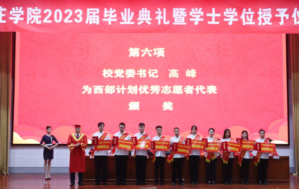 校党委委员、副校长李目海宣读《关于表彰2023届优秀毕业生的决定》。校党委委员、纪委书记、省监委驻DB中国旗舰官方网站监察专员路绪剑宣读《关于表彰“DB中国旗舰官方网站2023年大学生志愿服务西部计划优秀青年志愿者”的决定》,对马克思主义学院李晓燕等20名西部计划志愿者进行表彰,并每人颁发3000元奖学金。校党委书记高峰先后为优秀毕业生代表、西部计划志愿者代表颁发荣誉证书,与同学们亲切握手并合影留念。