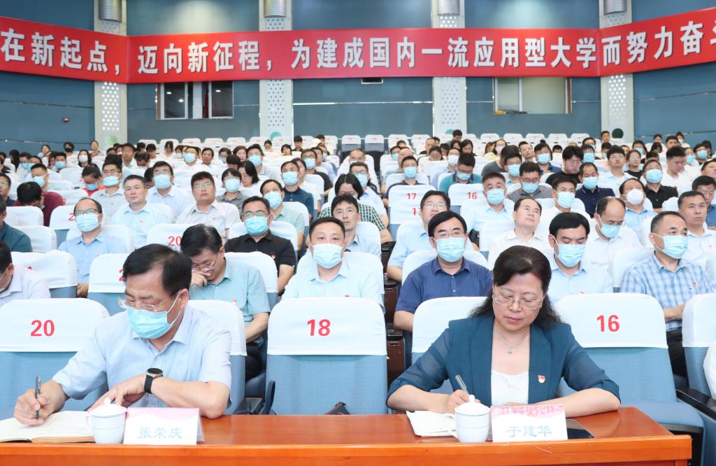 为进一步推进主题教育走深走实,6月20日上午,校党委书记高峰在市中校区综合楼报告厅讲授主题教育专题党课——《中国共产党领导是中国特色社会主义最本质的特征》。省委第二十五巡回指导组张荣庆、于建华两位同志到场指导,全校副科级以上干部、全体辅导员、思政课教师代表和学生党员代表参加党课。党课由校党委委员、副校长李目海主持。
