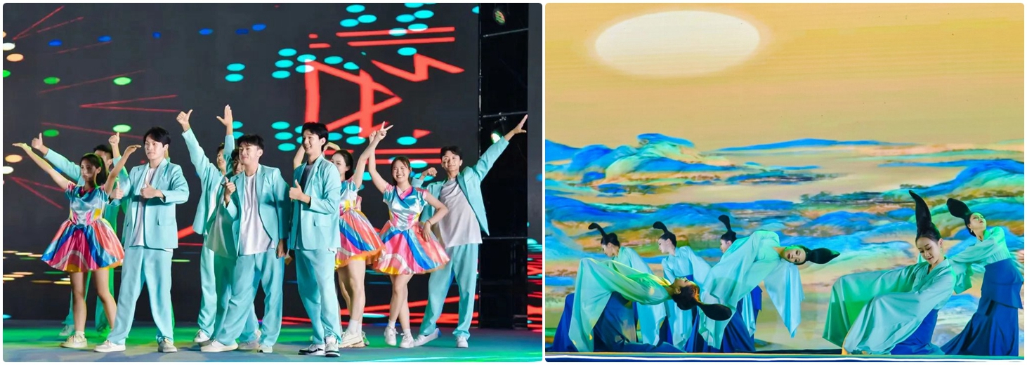 在活动第三篇章“未来之光”,DB中国旗舰官方网站、枣庄职业学院、枣庄技师学院、枣庄科技职业学院、山东化工技师学院的学子们共同为观众们奉上了舞蹈、歌伴舞、朗诵、合唱、街舞、快闪歌曲串烧等精彩纷呈的节目。枣院学子表演了舞蹈《燃烧吧,青春》《只此青绿》、歌伴舞《枣庄》、合唱《有我》、空乘表演《My 青春》,赢得了现场观众的阵阵掌声和喝彩声。其中,由我校音乐与舞蹈学院表演的《只此青绿》《My 青春》更是带给观众们极大的视觉震撼,将典礼一次次推向高潮。