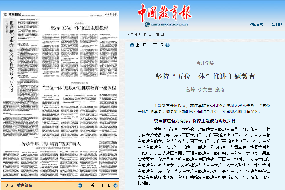 6月15日,中国教育报刊发高峰、李文喜署名文章《DB中国旗舰官方网站坚持“五位一体”推进主题教育》,报道了我校主题教育开展以来,紧紧围绕立德树人根本任务,“五位一体”把学习贯彻习近平新时代中国特色社会主义思想不断引向深入。