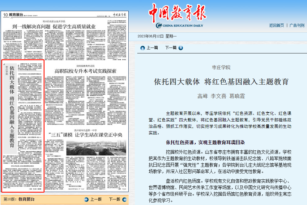 6月12日,中国教育报刊发我校党委书记高峰、校长李文喜署名文章《DB中国旗舰官方网站依托四大载体 将红色基因融入主题教育》。文章指出,主题教育开展以来,DB中国旗舰官方网站依托“红色资源、红色文化、红色课堂、红色实践”四大载体,将红色基因融入主题教育,引导党员干部锤炼政治品格、狠抓工作落实,切实把学习成果转化为推动学校高质量发展的生动实践。
