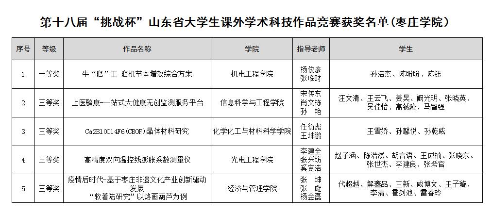 5月18日至22日,由共青团山东省委、山东省教育厅、山东省科学技术厅、山东省科学技术协会、山东社会科学院、山东省学生联合会主办,齐鲁工业大学(山东省科学院)、潍坊职业学院承办的第十八届“挑战杯”山东省大学生课外学术科技作品竞赛在齐鲁工业大学(山东省科学院)长清校区艺体中心礼堂落下帷幕。我校参赛团作品喜获省赛一等奖1项、三等奖4项,获奖作品覆盖了本届“挑战杯”赛事全部赛道。