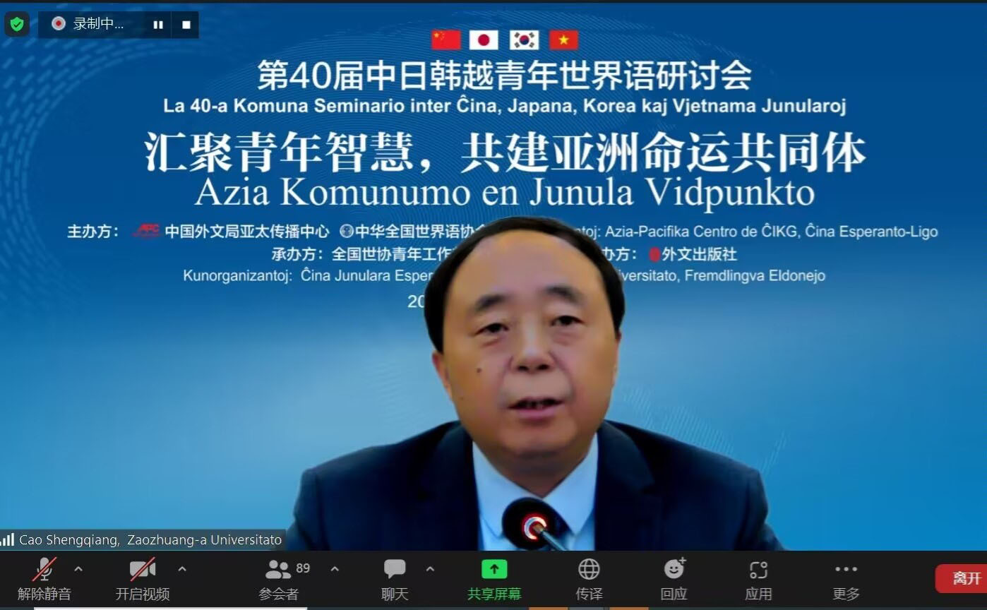 于涛在致辞中表示,尽管疫情阻碍经济发展,但世界语者总能满怀团结共识,携手战胜困难。中日韩越世界语研讨会是亚太地区最广为人知的青年世界语活动之一。通过本届研讨会,我们希望也相信能体察到亚洲青年的观点态度和进取热情。为了亚洲的未来和发展,我们需要构建拥有共同目标和合作愿望的共同体。