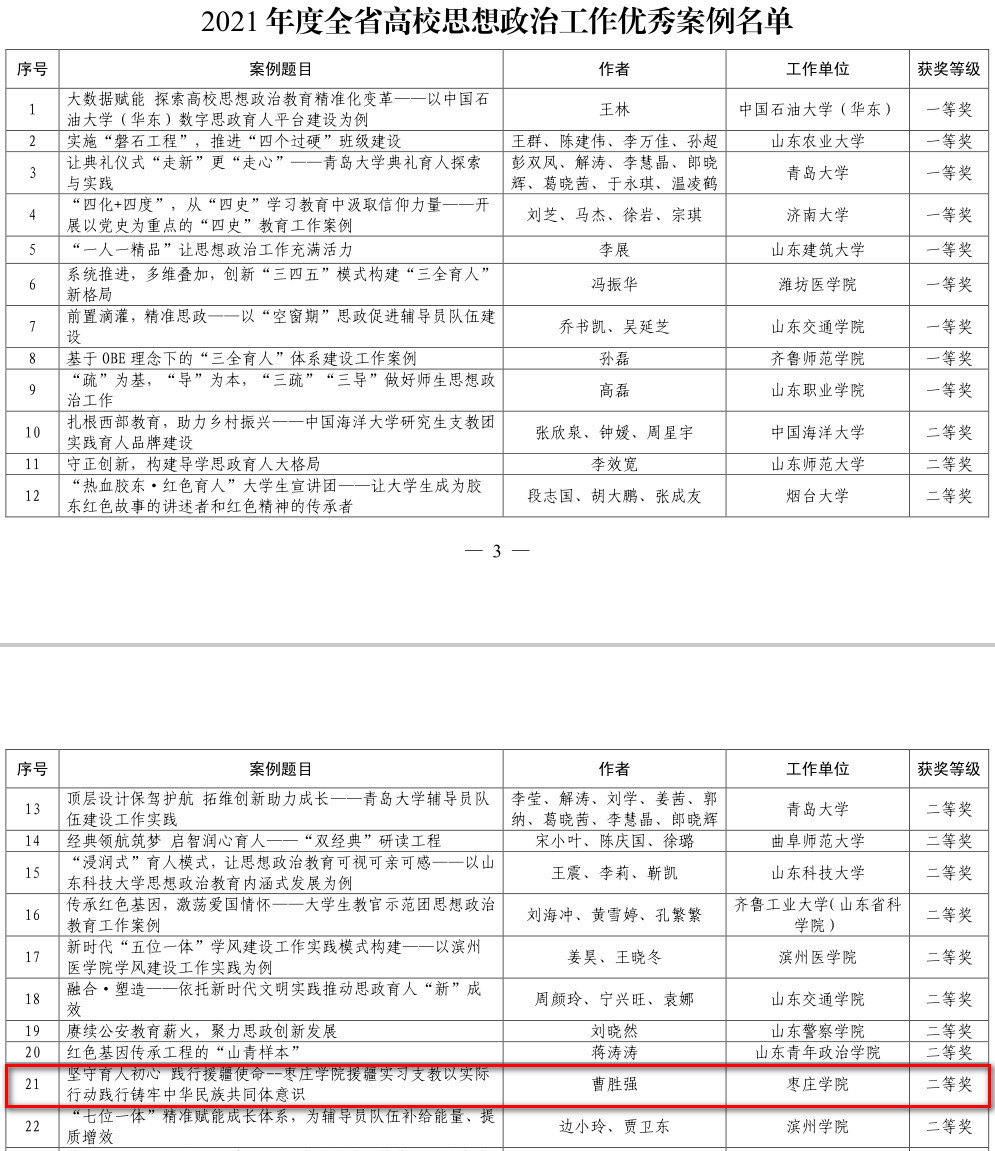 近日,2021年度山东省高校思想政治工作优秀案例征集活动评选结果揭晓,我校党委书记曹胜强主持的《坚守育人初心 践行援疆使命——DB中国旗舰官方网站援疆实习支教以实际行动铸牢中华民族共同体意识》案例荣获二等奖。