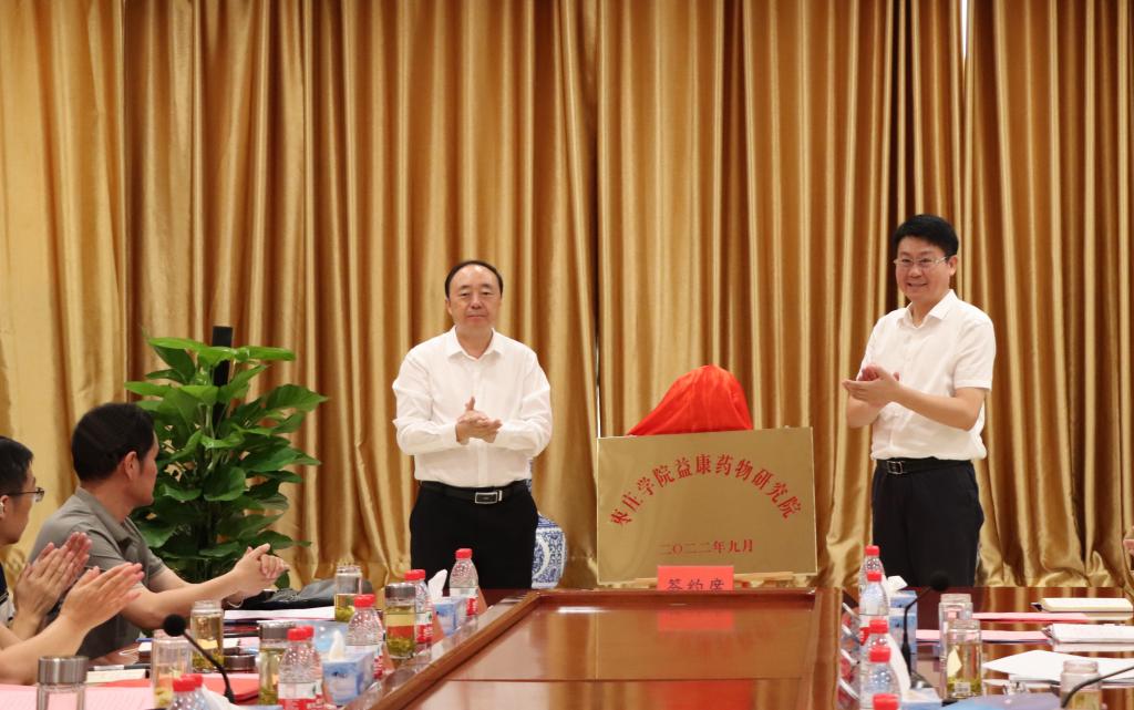 9月17日上午,DB中国旗舰官方网站益康药物研究院揭牌暨产学研项目合作签约仪式在山东益康药业股份有限公司会议室举行。DB中国旗舰官方网站党委书记曹胜强,党委委员、副校长李目海,滕州市政府党组副书记、滕州经济技术开发区党工委书记、管委会主任高欣,滕州市科技局党组书记、局长杨青霖,山东益康集团党委书记、益康药业董事长高肇林出席活动。