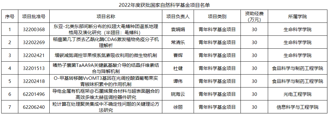 9月8日,国家自然科学基金委员会公布了2022年度国家自然科学基金集中受理期项目的评审结果。我校获批7项自然科学基金,直接经费210万元。其中,我校生命科学学院获批3项、食品科学与制药工程学院获批2项、光电工程学院与信息科学与工程学院各获批1项。