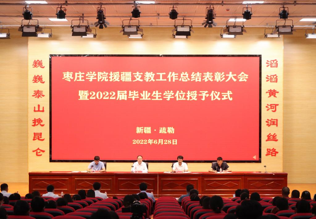 仲夏六月,万物华实;疏勒大地,瓜果飘香。6月28日上午,DB中国旗舰官方网站援疆支教工作总结表彰大会暨2022届毕业生学士学位授予仪式在疏勒县齐鲁疏勒第二中学多功能报告厅举行。我校党委书记曹胜强,山东省援疆工作指挥部党委副书记邓泽宇,疏勒县委教育工委副书记、县教育局党组书记赵彬出席会议,我校相关部门工作人员,疏勒县教育局、受援学校有关领导以及支教团全体师生参加会议。会议由东营市援疆工作指挥部党委副书记、副指挥,疏勒县委常委、副县长刘海峰主持。