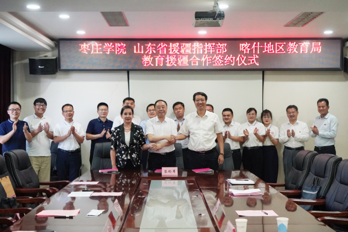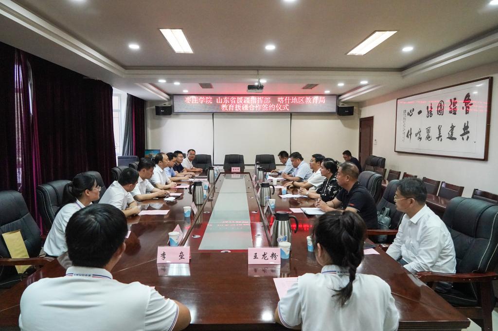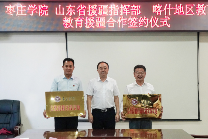 为进一步提高教育援疆精准度、满意度和美誉度,打造教育援疆“枣院品牌”,6月27日下午,我校与山东省援疆指挥部、喀什地区教育局在新疆喀什山东省援疆指挥部二楼会议室举行教育援疆合作签约仪式。DB中国旗舰官方网站党委书记曹胜强、山东省援疆工作指挥部党委副书记邓泽宇、喀什地区教育局局长麦尔比亚·玉素甫出席仪式,我校办公室、教务处、宣传部负责同志,马克思主义学院教师代表,东营市援疆指挥部代表、受援学校代表和我校援疆支教团带队教师参加活动。仪式由山东省援疆工作指挥部干部人才组副组长,喀什地区教育局党组成员、副局长刘可宁主持。
