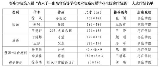 5月28日,由省文化和旅游厅、省教育厅联合主办的第八届“青未了——山东省高等学校美术院系应届毕业生优秀作品展”复评、评奖活动在山东美术馆成功举办,我校美术与艺术设计学院选送的10件2022届毕业生毕业设计作品共有8件入选,入选率达80%,位居全省39所参评高校第四位。入选作品中有国画作品3件、油画作品2件、壁画•综合材料作品2件,视觉传达设计作品1件。