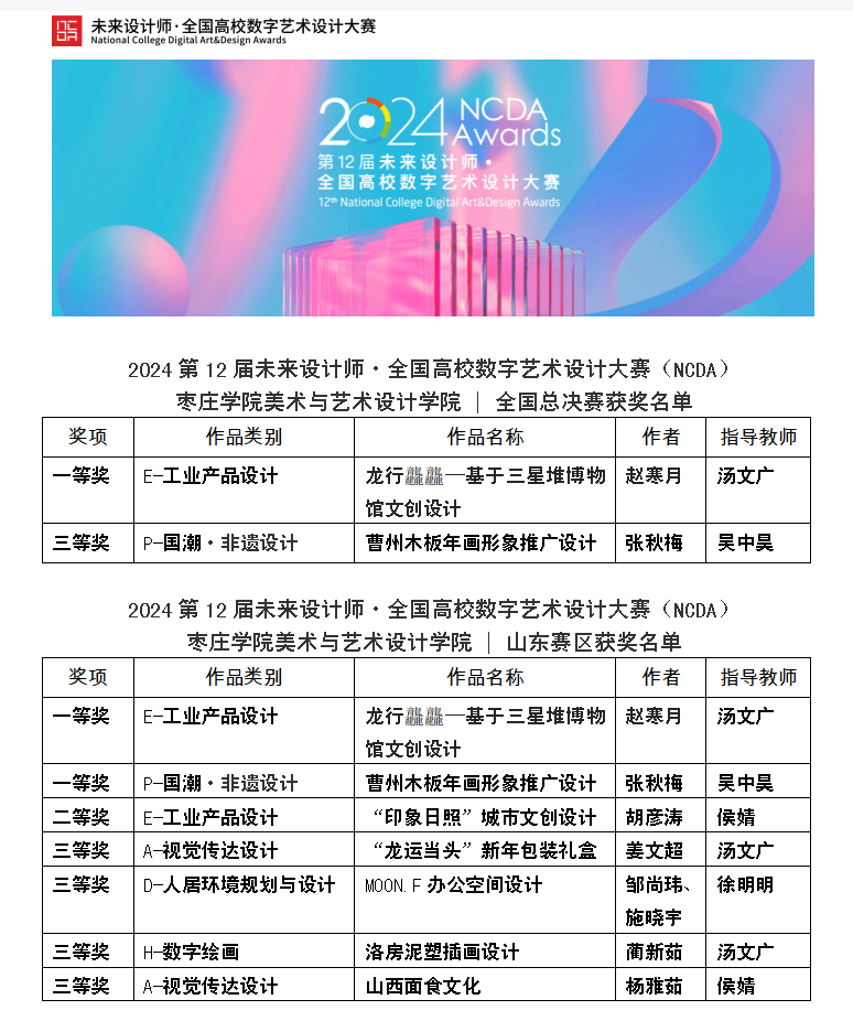 近日,第12届未来设计师·全国高校数字艺术设计大赛(NCDA)全国总决赛获奖名单揭晓,我校美术与艺术设计学院喜获全国总决赛一等奖1项、三等奖1项;山东赛区一等奖2项、二等奖1项、三等奖4项。