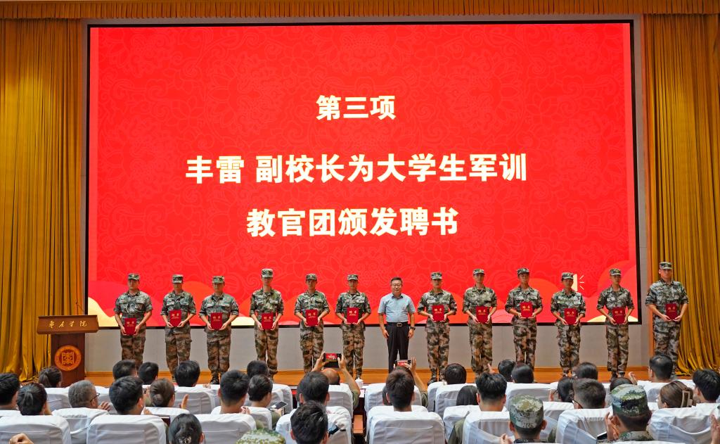 丰雷为大学生军训教官团授旗并进行动员讲话。他指出,军训是学校深入贯彻习近平强军思想、全面贯彻党的教育方针、落实立德树人根本任务、促进军事技能提升的重要途径。为切实做好新生军训工作,丰雷对全体教官提出三点要求:一要提高站位,把握方向,立起新时代学生军训的崭新形象。希望大家以过硬的专业素质、科学有效的训练方法当好指挥员,传承红色精神,以饱满的精神状态展现战士的刚毅、军人的品格;用军人的精神熏陶学生、用军人的作风要求学生、用军人的意识磨练学生。二要言传身教,严于律己,争当新生榜样和学生理想信念、价值引领的领路人。全体教官要与新生一道,进一步认识军训的意义,增强国防观念和国家安全意识,培养艰苦奋斗、吃苦耐劳的作风,树立正确的世界观、人生观、价值观,全面提升综合素质。希望大家珍惜机会,谦虚学习,争当新生榜样和学生理想信念、价值引领的领路人,力争取得思想觉悟、能力素质和作风形象方面的更大进步。三要科学施训,精心组织,切实履行军训教官的光荣使命。要加强自身军事技能的练习,及时总结,相互交流,本着对党、国家、军队和学生高度负责的态度,切实增强使命担当,展现出军人的飒爽英姿,以优良的个人品质、过硬的综合素质,科学的训练方法,切实履行军训教官的光荣使命。