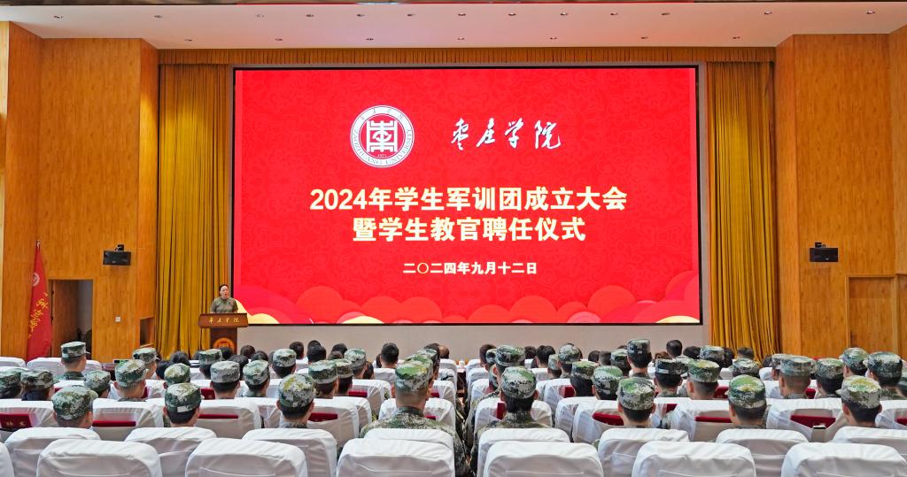 9月12日下午,我校在薛城校区崇德楼报告厅举行2024级学生军训团成立大会暨学生教官聘任仪式,校党委委员、副校长丰雷出席仪式并讲话。学校武装部负责同志、各二级学院党委副书记、全体2024级新生教官参加仪式。聘任仪式由校武装部副部长张昆主持。