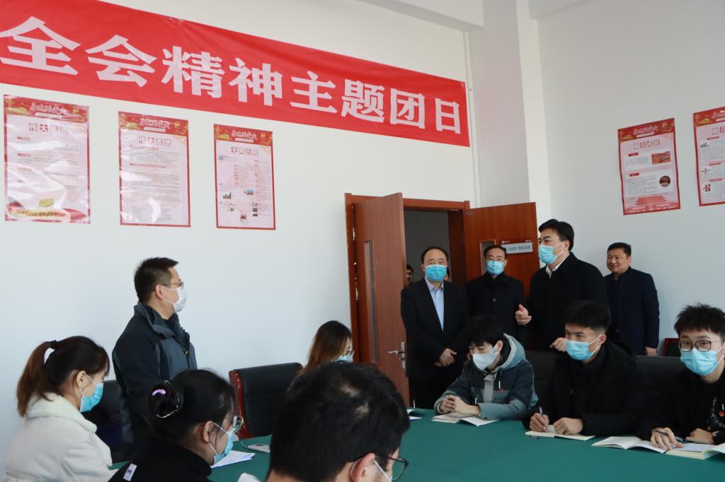 最后,刘天东一行走进传媒学院“宣传贯彻党的十九届六中全会精神主题团日”课堂,与师生就如何更好学习贯彻党的十九届六中全会精神进行了交流互动。