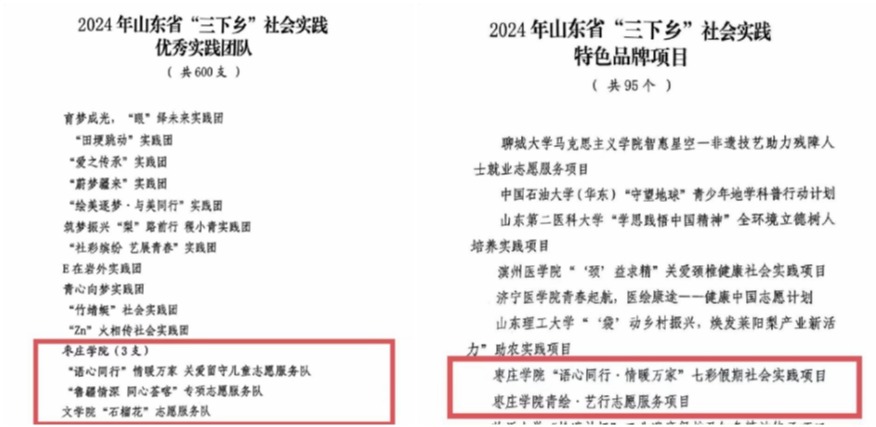 2024年,我校大学生志愿者暑期“三下乡”社会实践活动以“青春为中国式现代化挺膺担当”为主题,围绕习近平新时代中国特色社会主义思想宣传团、爱国主义教育实践团、中华文化传承团、乡村振兴促进团、基层服务践行团、“返家乡”社会实践等设置6个重点专题,共组建校级团队127支。一万余名师生充分发挥专业优势,以山东省及枣庄周边城市为重点,奔赴累计近40个区县、70余个乡镇开展实践活动,共发放宣传单页7300余份,帮助留守儿童1200余名,义务维修家电800余件,调研走访470余次,建立校地共建社会实践基地32个,活动受到新华网、中青网、大美校园等国家级、省市级媒体报道1300余篇。