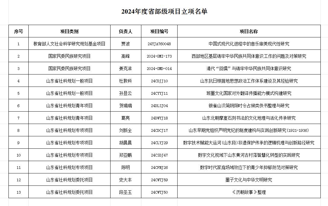 2024年度,学校共获批13项省部级科研项目。其中,获批教育部人文社会科学研究规划基金项目1项;获批国家民委民族研究项目2项,包括委托项目1项、自筹项目1项;获批山东省社会科学规划项目10项(其中一般项目4项、专项项目4项、委托项目2项),较去年增长230%。