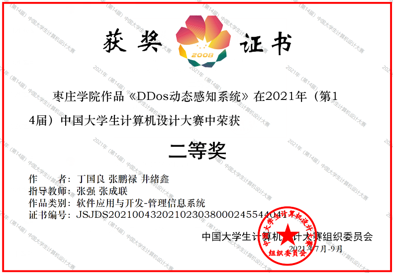 大赛自2021年3月启动报名,经过校内选拔赛及省赛多重考验,人工智能学院学生丁国良、张鹏禄、井绪鑫三人的作品《DDos动态感知系统》成功晋级国赛。三名同学在指导教师张强老师和张成联老师的悉心指导下,积极准备决赛答辩,最终荣获全国二等奖。另外,在山东省省级赛区中,我校人工智能学院、信息科学与工程学院和光电工程学院共有21组同学的参赛作品获得一等奖3项、二等奖3项、三等奖11项、优秀奖4项,成绩的取得充分展现了我校学生良好的综合素质和学科竞赛创新能力。
