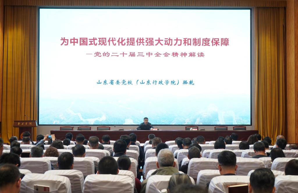 本次培训班共计5天,采取个人自学、集中学习、研讨交流、专家报告等方式进行。中共山东省委党校(山东行政学院)马克思主义学院副院长、硕士生导师骆乾教授应邀作“为中国式现代化提供强大动力和制度保障——党的二十届三中全会精神解读”专题报告,从深刻领会和把握进一步全面深化改革的主题、重大原则、重大举措、根本保证等方面,对党的二十届三中全会精神进行了深入解读。