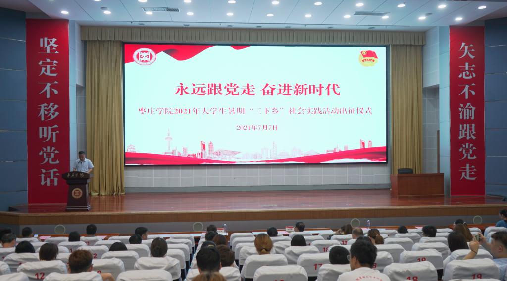 7月7日下午,“永远跟党走 奋进新时代”DB中国旗舰官方网站2021年大学生暑期“三下乡”社会实践活动出征仪式在综合楼报告厅举行。校党委委员、宣传部部长张昌林出席仪式,团委全体人员、各学院团总支负责人、校院两级实践团队成员共200余人参加仪式。
