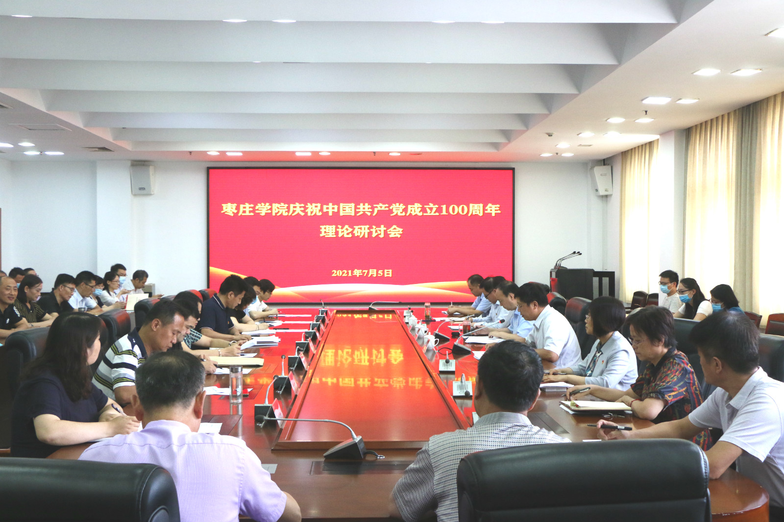 7月5日下午,我校在综合楼三楼会议室举办庆祝中国共产党成立100周年理论研讨会,深入总结阐释中国共产党百年伟大历程、辉煌成就和宝贵经验,激励全校师生不忘初心、牢记使命,开拓奋进、攻坚克难,开创学校更加美好未来。校党委书记曹胜强出席会议并讲话。副校长李目海,宣传部部长张昌林,获奖者和教师代表,社会科学处、文化研究与传播中心、自然国学研究院全体工作人员,各人文社科类学院(部)负责人和科研秘书出席会议。会议由李目海主持。
