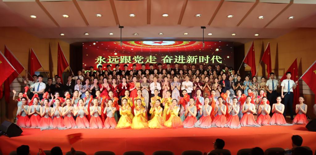 现场,歌声、掌声如潮。师生们的歌声或旋律激昂、气势澎湃,或婉转悠扬、韵味典雅,辅以绚丽多彩的服装和舞台设计,融合优美的舞蹈表演为观众奉上了一场精彩的视听盛宴。嘹亮的歌声回荡在上空,台上演员们深情放歌,台下观众也情不自禁地跟着一起唱和。演出最后,雄壮激昂的音乐再次响起,全体人员一起挥舞手中的党旗,学校领导走上舞台,带领现场师生齐声高唱《没有共产党就没有新中国》,用歌声抒发着对党的感恩之情和庆祝建党百年华诞的喜悦之情,也唱出了担当新使命、奋进新时代的最强音。