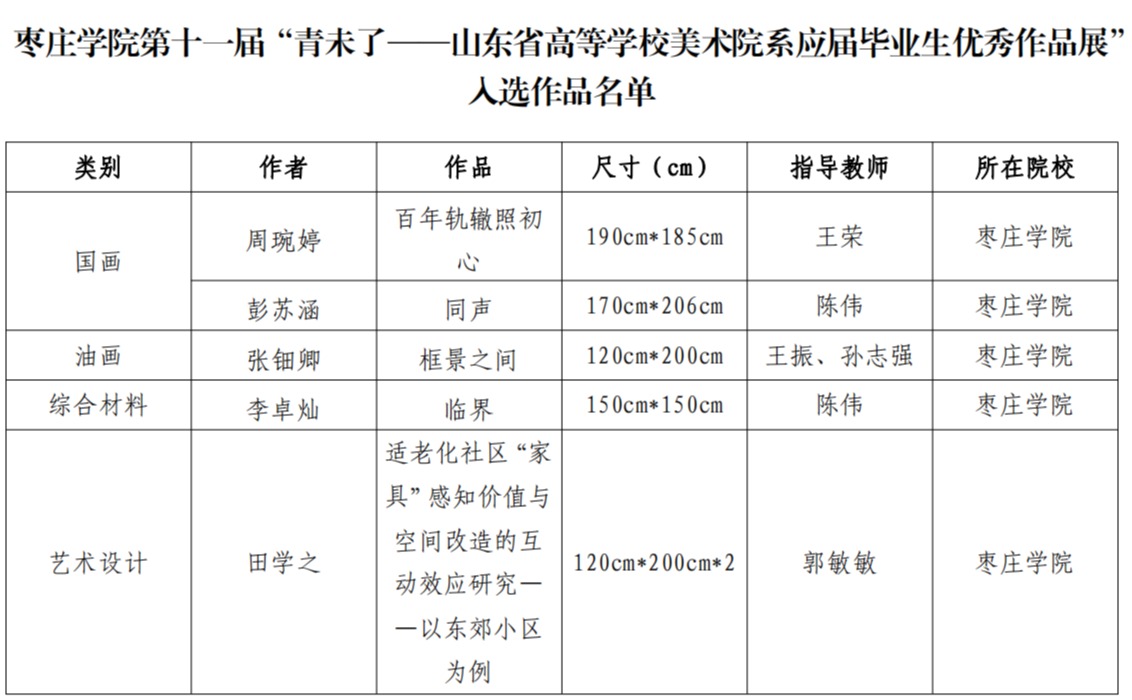 近日,由山东省文化和旅游厅、山东省教育厅主办、山东美术馆承办的第十一届“青未了——山东省高等学校美术院系应届毕业生优秀作品展”入选作品名单公布。我校美术与艺术设计学院选送的2025届毕业生毕业设计作品有5件入选,其中国画作品2件,油画、综合材料、艺术设计作品各1件,入选数量和入选率均居省内同类本科院校前列。