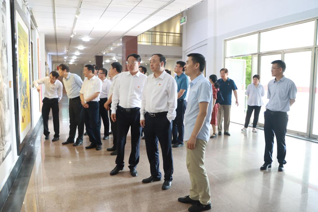盛世和谐铸辉煌,翰墨丹青献给党。6月29日下午,由党委宣传部、工会、离退休工作处主办,美术与艺术设计学院、传媒学院承办的“翰墨飘香颂党恩、丹青敷彩绘初心”庆祝中国共产党成立100周年书画摄影展,在美术与艺术设计学院一楼展厅正式展出。校领导曹胜强、李文喜、曾宪明、李目海、路绪剑、丰雷、安涛、孙正、张昌林、林勇,莅临书画摄影展参观指导。办公室、工会、离退休工作处、美术与艺术设计学院负责人与部分师生陪同参观。
