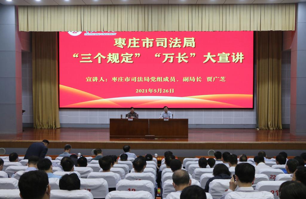 5月26日下午,我校在综合楼报告厅举行枣庄市司法局“三个规定”“万长”大宣讲,枣庄市司法局党组成员、副局长贾广芝作了题为《“三个规定”有关政策》的专题辅导报告。校党委副书记曾宪明出席宣讲会,全校处科级干部听取宣讲报告。宣讲会由校党委委员、宣传部部长张昌林主持。