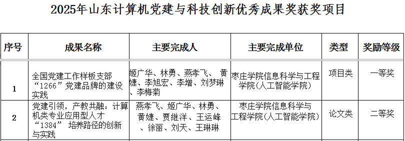 近日,山东计算机学会公布2025年党建与科技创新优秀成果奖评选结果,信息科学与工程学院(人工智能学院)两项成果《全国党建工作样板支部“1266”党建品牌的建设实践》和《党建引领,产教融合:计算机类专业应用型人才“1384”培养路径的创新与实践》分别荣获一等奖和二等奖。
