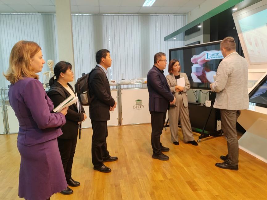 在白俄罗斯国立技术大学园区,发展战略与规划副总监潘科娃·斯维特兰娜·瓦西里耶芙娜、白俄罗斯-中国科技合作中心主任阿列克谢·阿尔多申等专家接待了代表团一行。代表团参观了科技成果展览,听取了白俄罗斯国立技术大学在材料科学、机械工程、医工结合等方面的科研成果及成果转化介绍。随后,双方举行座谈交流,并一致认为应尽快在国际联合实验室建设、成果转化、学生学历提升、实训基地建设等领域开展合作。