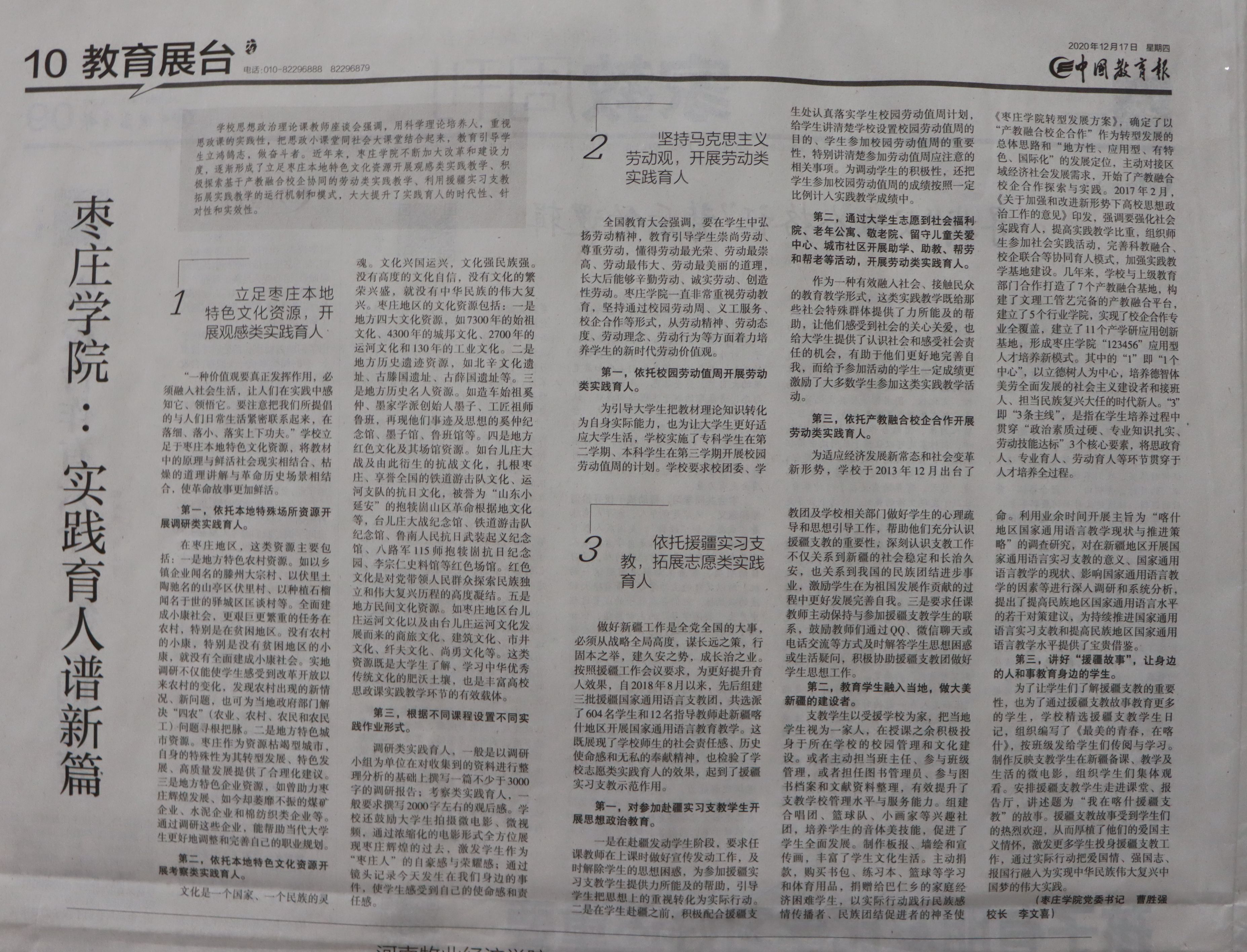 近日,《中国教育报》第10版刊发我校党委书记曹胜强、校长李文喜署名文章《DB中国旗舰官方网站:实践育人谱新篇》,从“立足枣庄本地特色文化资源,开展观感类实践育人”“坚持马克思主义劳动观,开展劳动类实践育人”“依托援疆实习支教,拓展志愿类实践育人”三个方面,全面介绍了我校实践育人开展情况及相关经验做法。