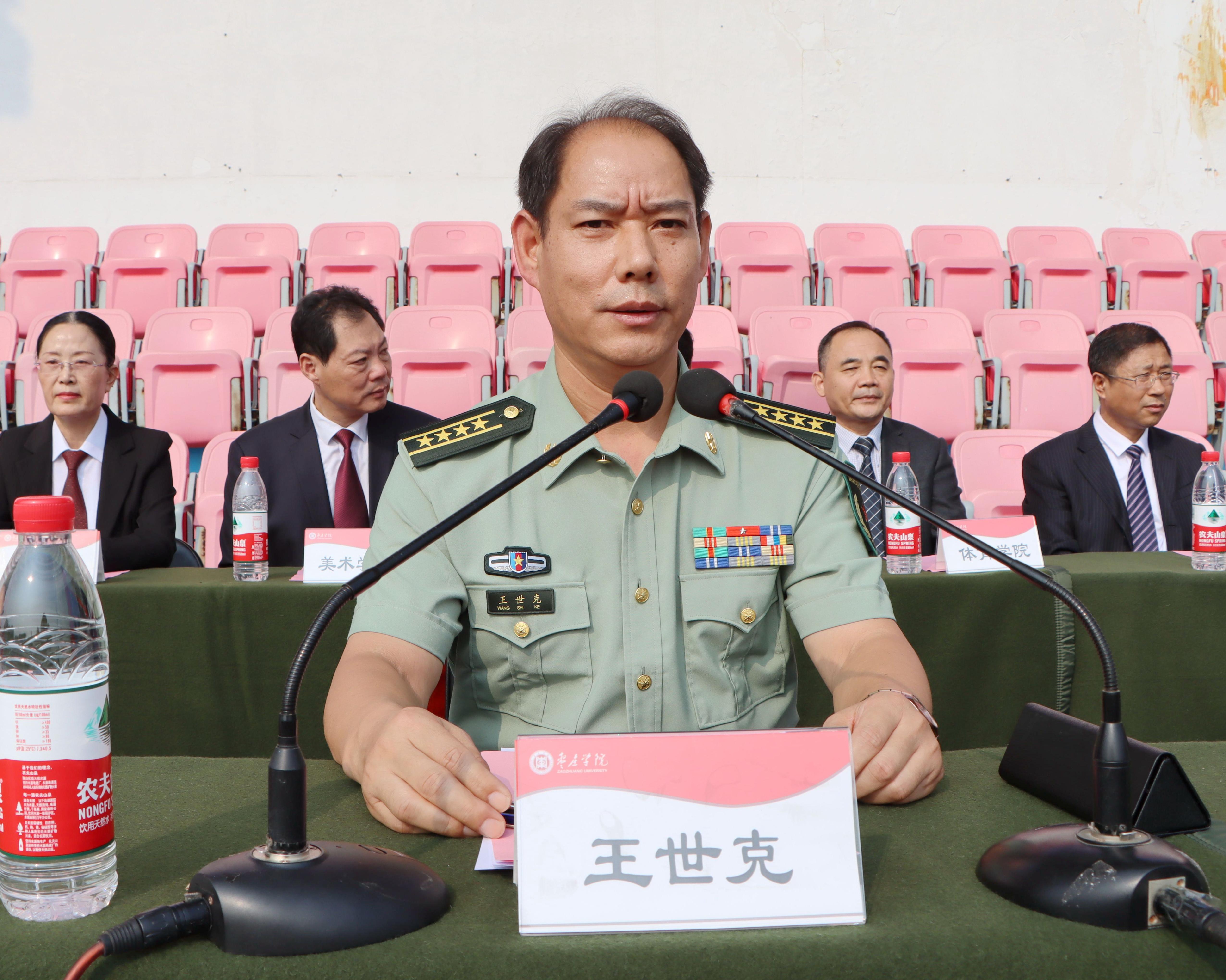 典礼上,王世克代表枣庄军分区全体官兵对向始终关心军校共建工作和高度重视军训工作的学校党委表示衷心感谢,向开始崭新大学生活的2020级全体新生表示热烈祝贺。王世克指出,在学校全面开展军事训练、进行国防教育,是党中央、国务院的伟大战略举措,是实现立德树人根本任务、培养高素质后备兵员和提高教育质量的重要途径,对加快推进国防现代化建设、人力资源强国建设和实现中华民族伟大复兴具有重要意义。为保证军训工作顺利开展,王世克对全体参训人员提出以下希望和要求:一要科学统筹、按纲施训。要按照试点任务明确的训练时间和内容,结合年度教学计划,科学严密组织,针对训练课程特点,区分不同专业类型,争取多出亮点和可供推广的经验做法。要根据学生身体情况,把握好训练的强度和进度,做到劳逸结合,循序渐进。二要严格要求、刻苦训练。军训标准高、要求严,希望同学们勇于激发斗志、磨炼意志、克服困难、排除干扰。三要严守纪律、加强管理,同学们要自觉服从老师和教官的命令与指挥,树立集体主义意识、克服个人主义思想,绝不允许出现任何违纪行为。