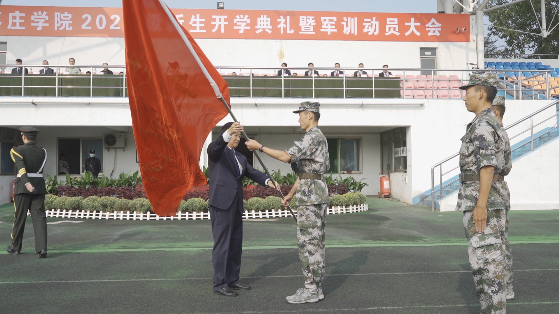 魅力枣院纳贤才,新生学子正戎装。9月24日上午,我校在西田径场隆重举行2020级新生开学典礼暨军训动员大会。校领导曹胜强、李东、曾宪明、明清河、李目海、李丽清、路绪剑,枣庄市军分区副司令王世克、枣庄市市中区人武部政委宫本星出席典礼,二级学院及相关部门负责人,辅导员、教师代表、全体新生和教官共6000余人参加典礼。典礼由校党委副书记曾宪明主持。