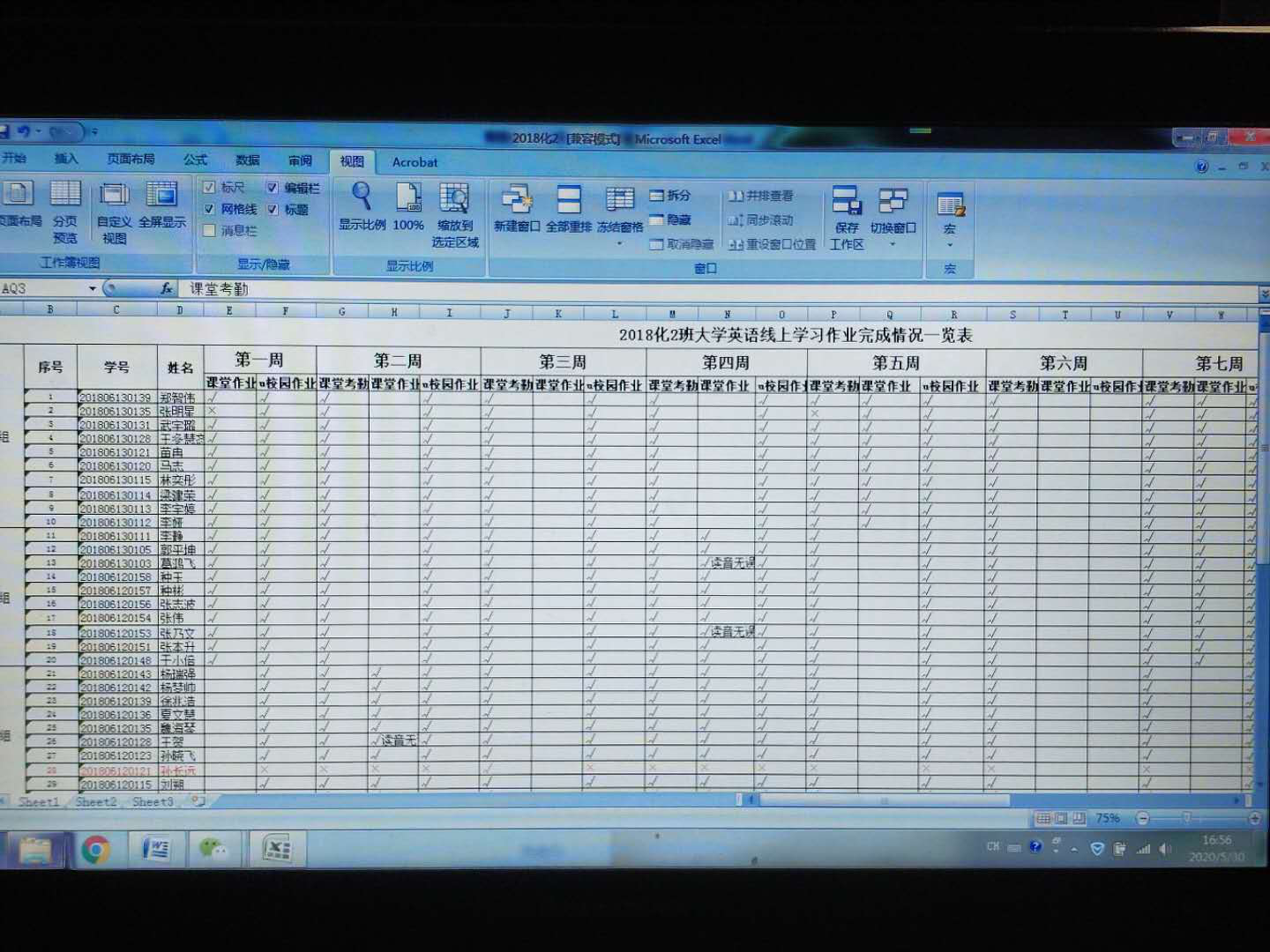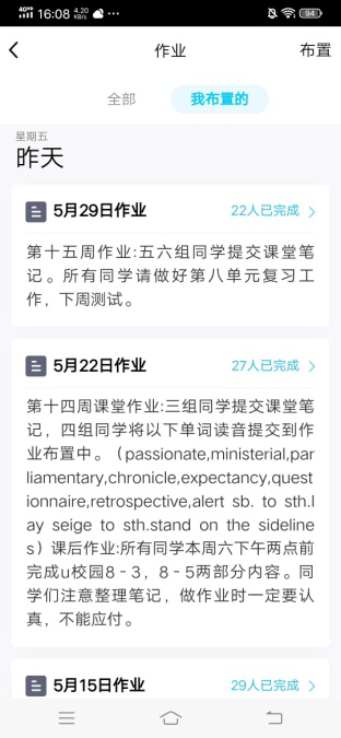 作业分为课堂作业和课后作业两部分。课堂作业包括音频上传和课堂笔记,课后作业学生通过U校园完成老师布置的单元任务。将每班学生分成六组,每节课抽两组上交课堂作业,并当堂点评;课后作业需要所有学生提交,通过截图形式提醒没完成作业的学生按时完成,每周末进行反馈。从开学第一周到目前每周都以Excel表格的形式记录学生的学习情况。