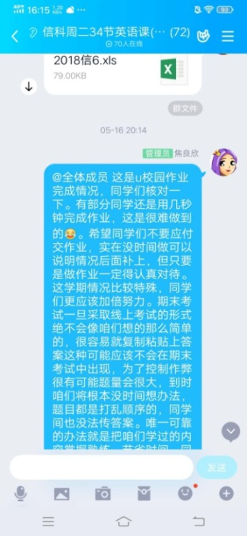 《大学英语4》是为非英语专业本科二年级学生开设的公共英语课程。本课程旨在培养学生语言技能,培养学生的英语综合应用能力,以及理解、沟通、表达能力和批判性思维能力,培养学生的跨文化交际意识和交际能力,为“讲好中国故事”和学习国外科学知识搭建沟通桥梁。大学英语教学部焦良欣老师本学期担任《大学英语4》四个本科班的教学工作,在深入分析学情的基础上,设计了“PPT录播+QQ群投票签到+QQ群在线上课+QQ群作业+U校园+课后反馈”的混合式线上教学模式。