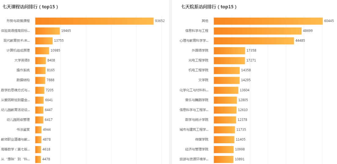 根据超星平台提供的大数据分析,可以查看本周课程打开次数、课程访问排行、较为频繁的活动类型、活跃度最高的院系和学习端口占比分别为: