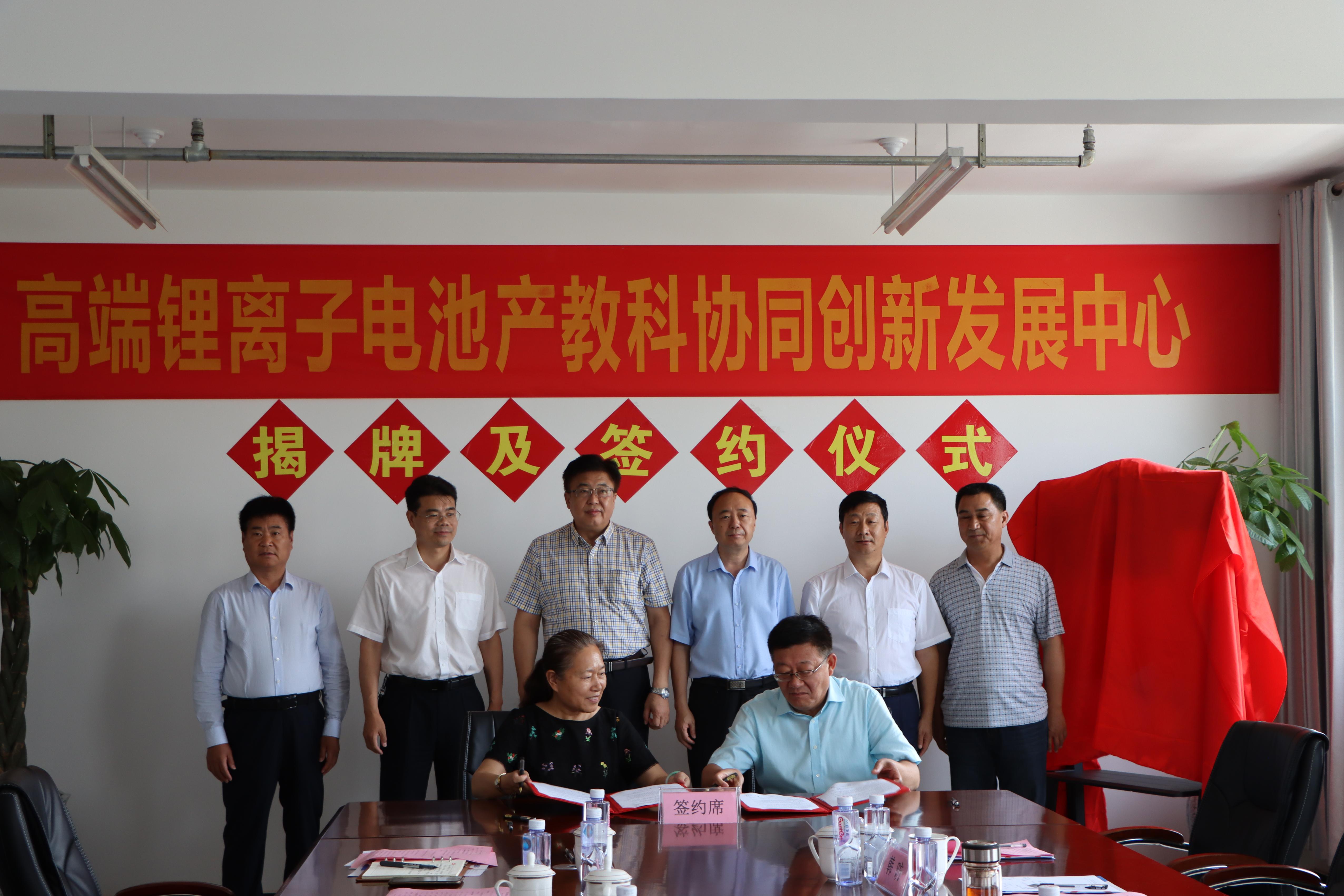 曹胜强与周宗安共同为DB中国旗舰官方网站-山东天瀚新能源科技有限公司“高端锂离子电池产教科协同创新发展中心”揭牌,李丽清代表我校与山东天瀚新能源科技有限公司总经理陈凡伟签署合作协议。