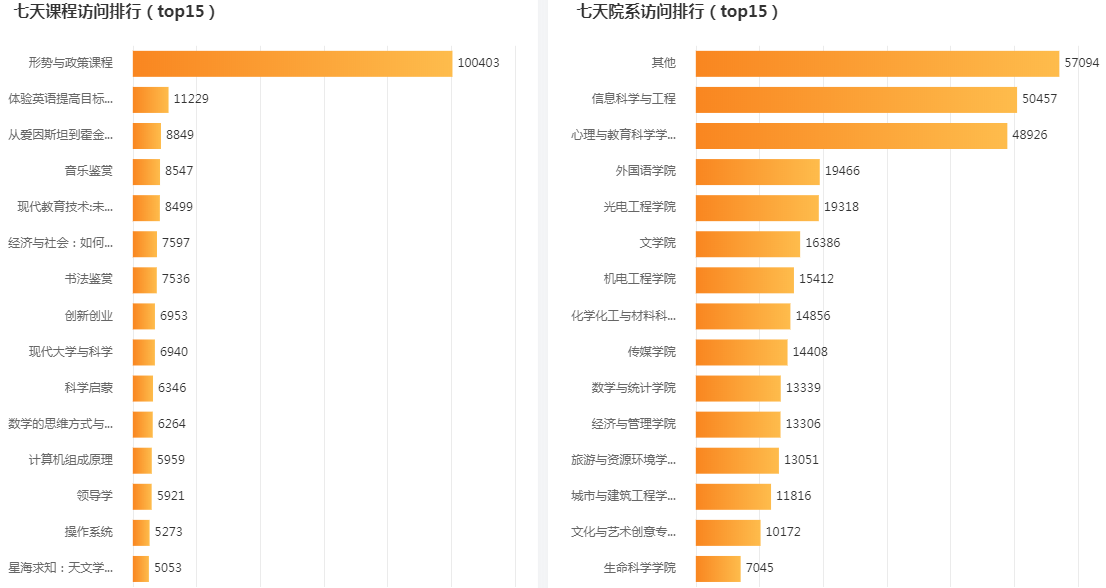 根据超星平台提供的大数据分析,可以查看本周课程打开次数、课程访问排行、较为频繁的活动类型、活跃度最高的院系和学习端口占比分别为: