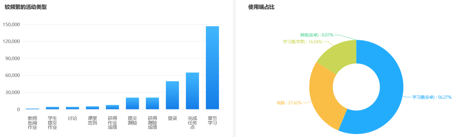 根据超星平台提供的大数据分析,可以查看本周课程打开次数、课程访问排行、较为频繁的活动类型、活跃度最高的院系和学习端口占比分别为: