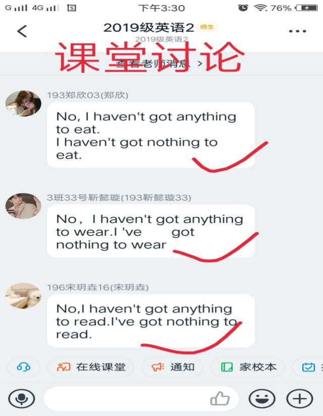 之后进入新课环节,有了预习作铺垫,单词的讲解稍作强调后,便转入课文分析,对课文中出现的常用短语和句型进行着重讲解。期间不断利用抢答和提问的形式和学生互动,并随机抽查学生的笔记情况,提醒学生保持专注。2019级英语(2)我们学习了113-116共四课,语法环节着重学习了复合不定代词的用法,我们由已学过的知识迁移到新授课,学生的理解普遍较好。2017级的第43课着重学习了情态动词can、could和be able to 的区别,经过大量的练习,学生掌握较好。