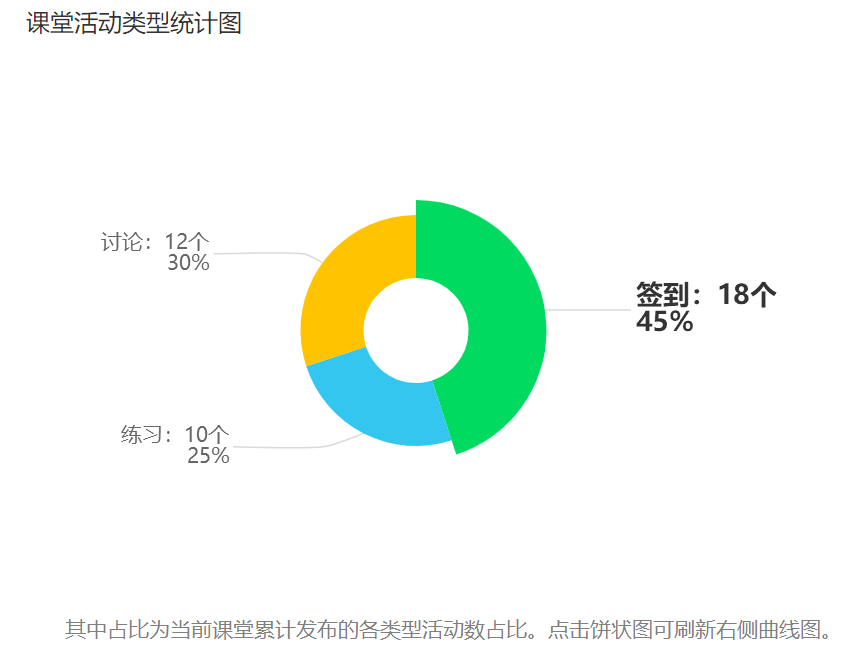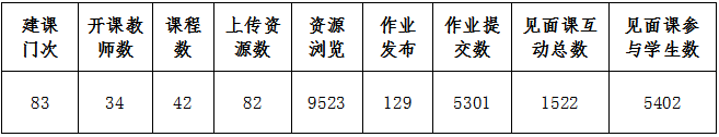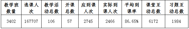 我校师生在雨课堂平台使用情况,根据大数据统计,由此查看本周教学班数量、教学活动总、开课总数、应到课人次、实际到课人次、课堂互动总数、平均到课率、习题互动总数,详情见下表: