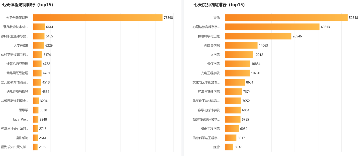 根据超星平台提供的大数据分析,可以查看本周课程打开次数、课程访问排行、较为频繁的活动类型、活跃度最高的院系和学习端口占比分别为: